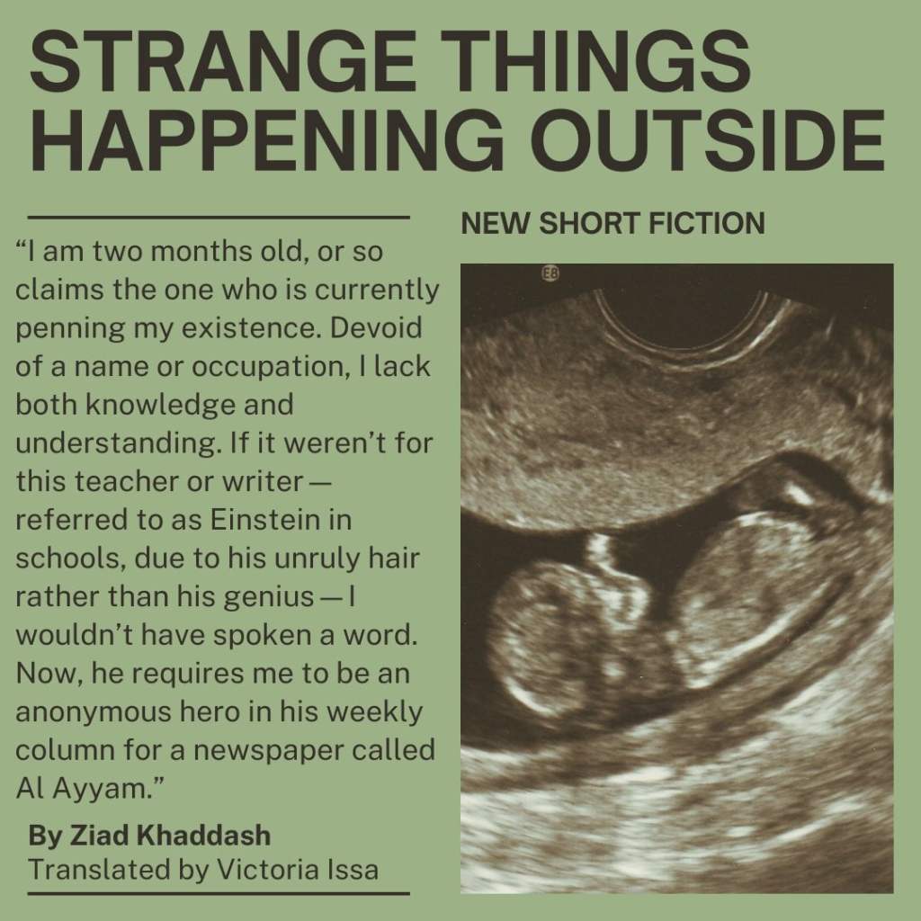 “Strange Things Happening Outside” by Palestinian writer Ziad Khaddash, published on Arablit. The story immerses readers in the unsettling world of an unborn child witnessing the turmoil of war in Gaza. Through the child’s newfound senses, the story poignantly explores the impact of conflict on a mother and her unborn child, capturing the essence of life, loss, and the haunting realities of displacement.
